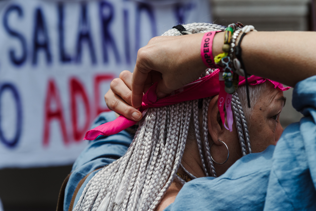 - A demonstrator is tying a headband in the colours of the Women's Strike.