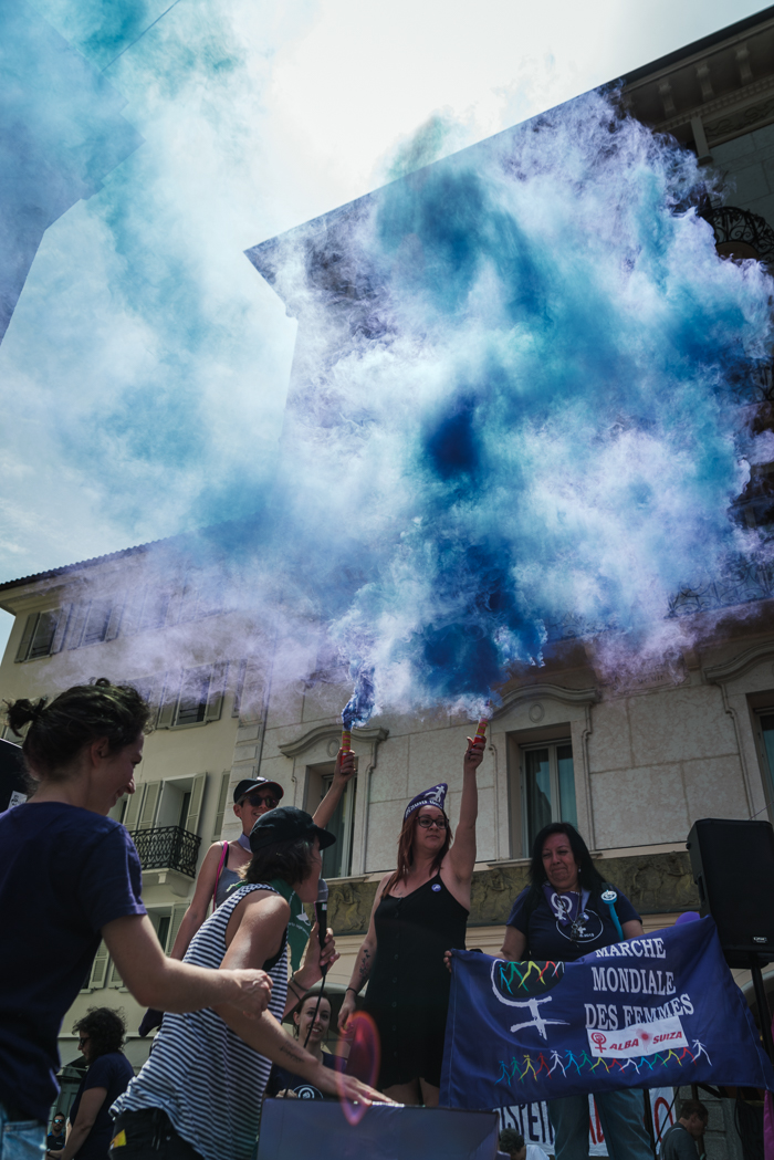 - Some demonstrators march with purple smoke bombs in their hands in Piazza della Riforma, Lugano.