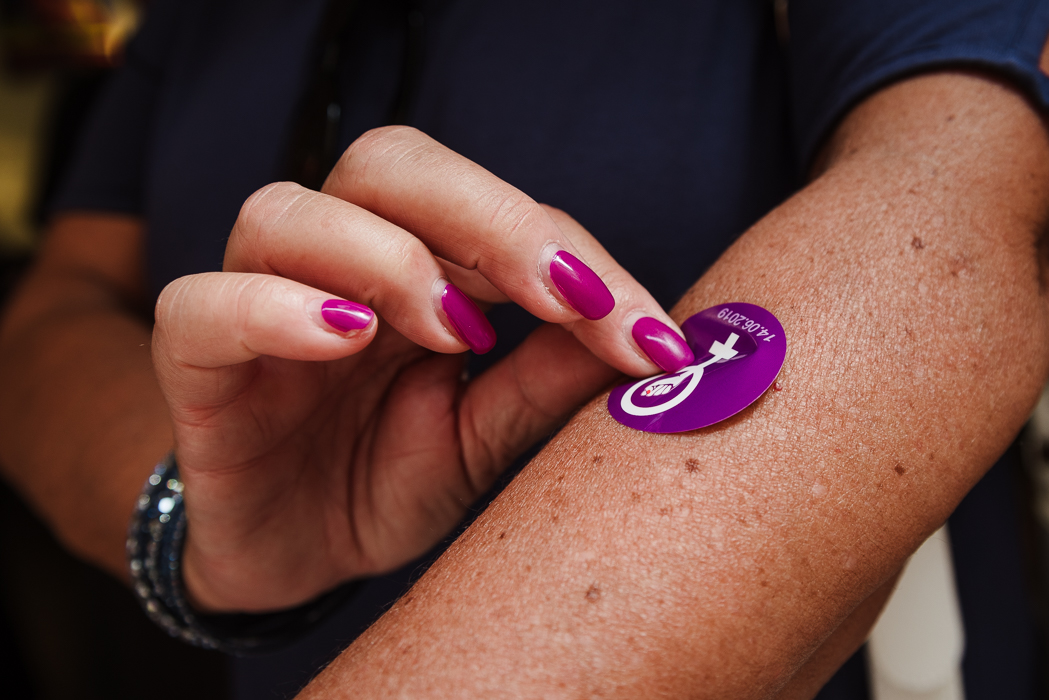 - A woman taking part in the 2019 Women's Strike is seen applying a sticker to her arm.
