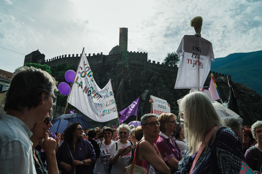 - The hill overlooking Piazza del Sole in Bellinzona, with Castelgrande on top, is seen from the perspective of the participants in the 2019 Women's Strike march.