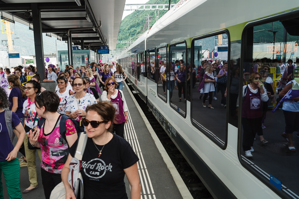 - The women who came to Bellinzona via train to join the main march are seen on the station's platform.