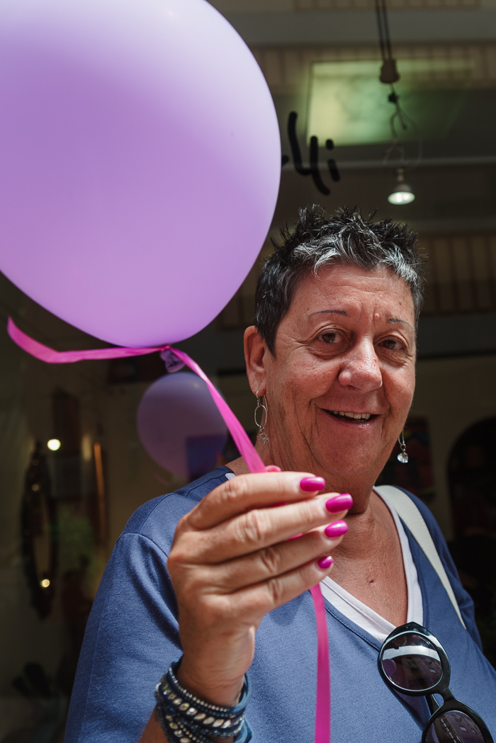 - A woman is seen holding a purple balloon in support of the 2019 Women's Strike.