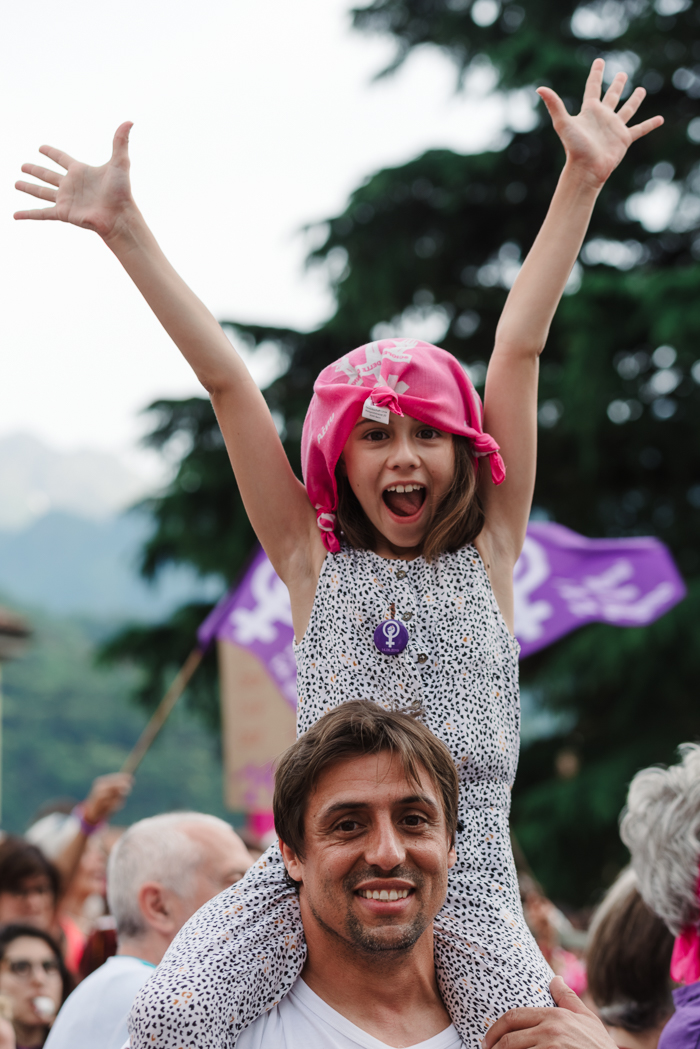 - A young girl standing on her father's shoulders (probably) is seen throwing her hands in the air at the 2019 Women's Strike in Bellinzona.